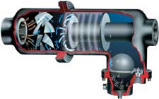Moisture laden gas enters the inlet of the separator where it is deflected by a unique CenpellarTM into a centrifugal motion. The entrained solids and moisture droplets are separated out by a reduction in velocity. Separated liquid and solids fall into the separators’ integral drain trap where the exclusive Eaton Vortex Containment Plate (VCP) ensures that they cannot be re-entrained. The VCP is constructed with a series of carefully placed rings and plates that shield the separated liquid from the vortex action within the separator to prevent re-entrainment. The VCP also helps direct the liquid to the drain trap while at the same time moves the clean, dry gas to the separator outlet. With Eaton’s exclusive VCP the need for expensive, delicate baffles that are used in ordinary separators is eliminated.